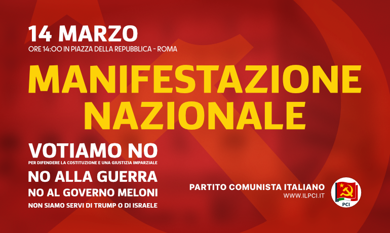 Il Partito Comunista Italiano chiama lavoratrici e lavoratori, giovani, pensionati e tutte le forze democratiche e popolari a partecipare alla manifestazione per affermare con forza una prospettiva di pace, giustizia sociale e indipendenza nazionale.